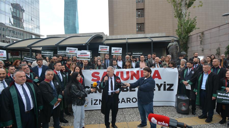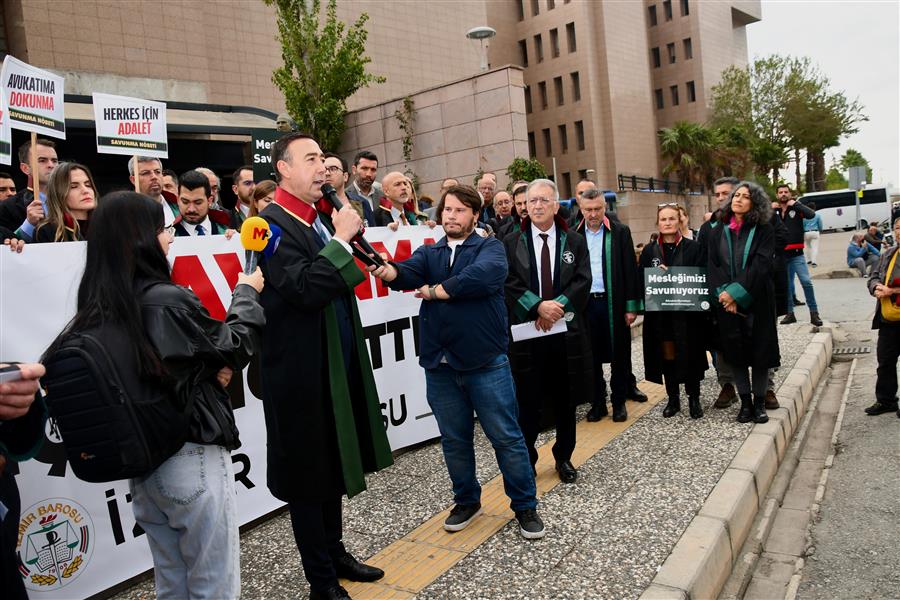 İzmir Adliyesi C Blok önünde, “Savunma Nöbeti” kapsamında avukatlar bir araya geldi. Açılış konuşmasını İzmir Barosu Başkanı Av. Sefa Yılmaz yaptı.