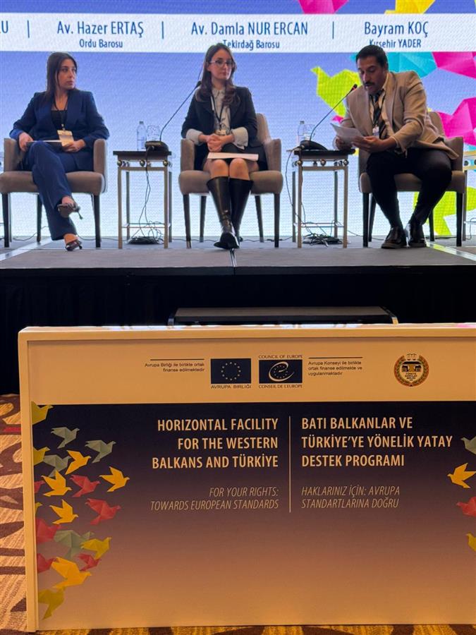 Avrupa Birliği ve Avrupa Konseyi tarafından fonlanan Batı Balkanlar ve Türkiye'ye Yönelik Yatay Destek Programı kapanış konferansı 30/09/2025 günü, Ankara'da gerçekleşti. Konferansa Baromuzu temsilen Baro Başkan Yardımcımız Av. Zümrüt Canku Arslan Kadın Hakları ve Toplumsal Cinsiyet Eşitliği Komisyonu Başkanımız Av. Damla Nur ERCAN panelist olarak katılım sağladı. Program kapsamında Tekirdağ hem Romacted II Projesinin, hem de İMDAT Derneği ile Türk-Alman Üniversitesi iş birliği ile yürütülen "Kadınlar için Adalet" projesinin uygulama sahası olarak seçilmişti. Romacted II Projesi kapsamında Muratlı Belediyesi işbirliği ile dezavantajlı kadınlara yönelik hukuk okur yazarlığı eğitimlerinde eğitmen olarak görev yapmış olan Av. Damla Nur Ercan, paneldeki konuşmasında saha izlenimlerini, Tekirdağ Barosu anlamında proje çıktılarını anlattı. Ayrıca Tekirdağ Barosunca sahada tespit edilen sorunlara yönelik yürütülen proje taslaklarından bahsederek hibe desteği arayışımızı Avrupa Birliği ve Avrupa Konseyi Türkiye Proje Ofisi temsilcilerine iletti.